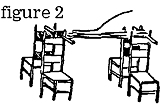The first is to measure your warp threads around a header cord and sew the header cord to the beam, spacing the warp threads evenly. I use four ladder-backed chairs and a broomstick. Tie the header cord to the backs of two of the chairs and place a broomstick over the the backs of two more (figure 2). The distance between the two sets of chairs should equal the length of the finished warp. Attach your ball of warp to the broomstick and unwind the warp until you reach the cord. Go over the broomstick and unwind the warp until you reach the cord. Go over the broomstick and back to the cord. You are using a figure 8 pattern and if done correctly, that is how your warp will appear if viewed from the side.